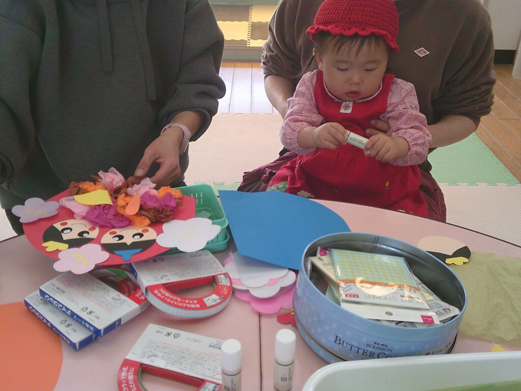 ひなまつりの製作でフラワーペーパーやシールを使って